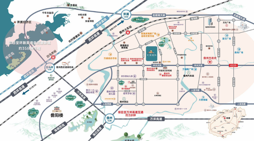 位于城市核心生活圈,距离万洋高速入口仅2公里,约30分钟车程即可到白马井高铁站,2小时触达全岛,百米内有佳华农贸市场,5公里内有夏日国际广场,海南西部中心医院,新中医院等。