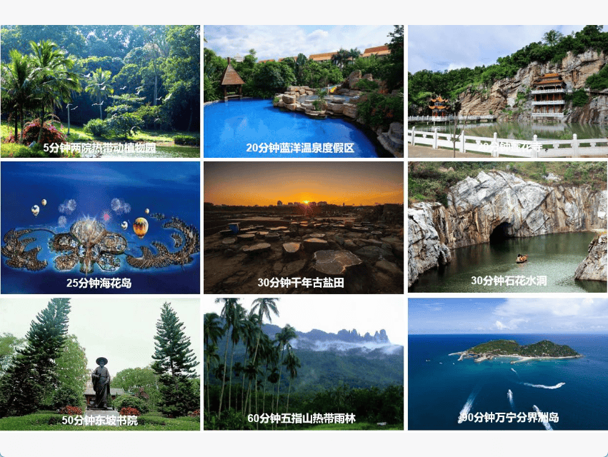 30分钟可达景点:石花水洞地质公园、东坡书院、环岛旅游公路儋州段(光村银滩/龙门激浪)、千年古盐田、海南海花岛、白鹭天堂等。