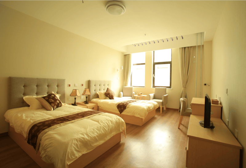 总建筑面积约6万平米,规划821张床位,涵盖自理公寓(436张)、护理公寓(360张)及亲情公寓(套房),单人间、一室一厅、两室一厅等多种户型可选,适配不同家庭需求。房间均配备防滑地板、紧急呼叫系统、适老化家具、新风系统、地暖,细节之处守护长辈安全与舒适。