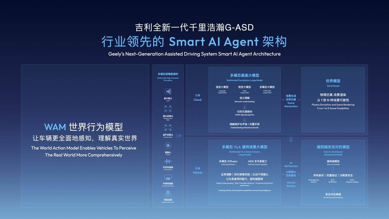 G-ASD的技术底气,源于其构筑的三大核心支柱:数据、算力与算法。在数据层面,依托超过850万辆搭载L2级以上辅助驾驶的吉利集团车辆,其积累的实路智驾里程已超百亿公里,并拥有数千万段高质量场景视频数据,为AI模型提供了全球车企中极具规模和多样性的“经验库”。在算力层面,吉利星睿智算中心可调用的云端算力高达23.5 EFLOPS,位居行业前列,为千亿参数大模型的训练与快速迭代提供了充沛动力。在算法架构上,其创新的Smart AI Agent,实现了车端VLA大模型与云端世界模型的协同,融合了实时感知推理与虚拟仿真学习,构成了技术领先的“双脑”系统。