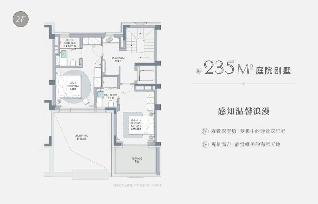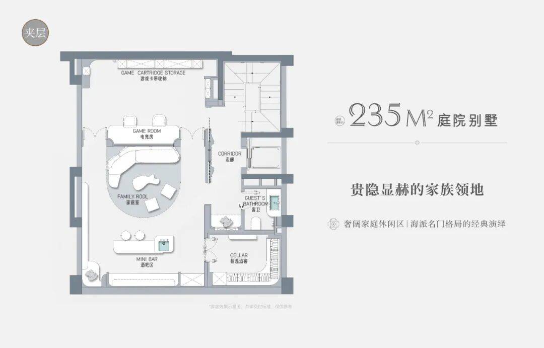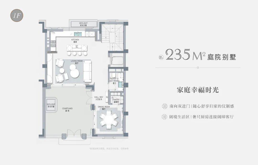以建面约235㎡的庭院别墅样板房为例,户型附赠地下室、庭院、露台、阁楼空间