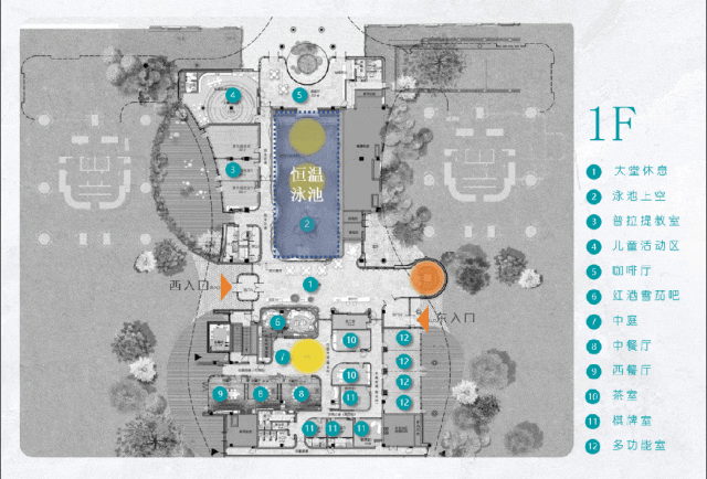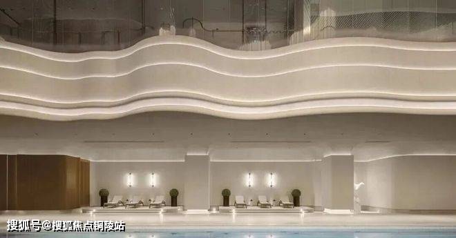 恒温泳池挑高约10米,营造出场馆级的开阔体验,顶部采光井将自然光引入池区,配合全地暖覆盖的更衣区与休息平台,整体对标重奢酒店的度假标准。