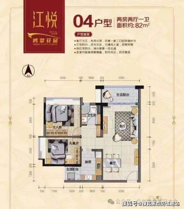 :该户型是项目的热门户型,兼顾实用性和舒适性。户型方正实用,动静分区明确,客厅和两个卧室均朝南,采光通风极佳。客厅连接南向阳台,视野开阔。主卧面积约 14 平方米,宽敞舒适,可放置 1.8 米大床和衣柜。两个次卧面积分别约为 9 平方米和 8 平方米,可分别作为儿童房和书房使用。厨房采用 L 型设计,操作空间充足。卫生间干湿分离,使用方便。该户型适合三口之家居住。