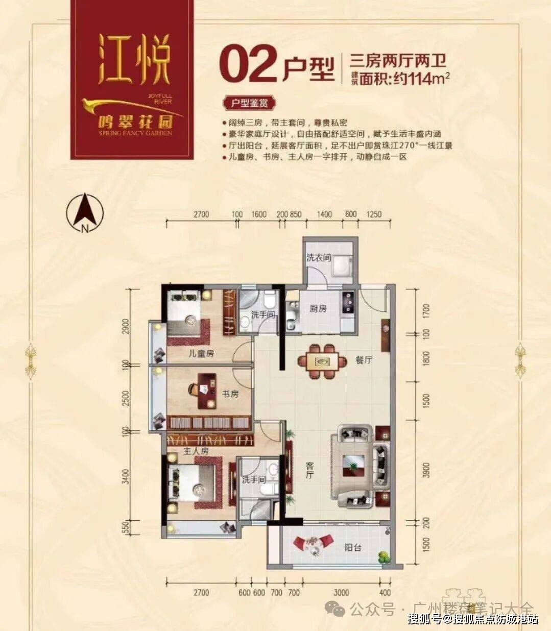 :该户型是项目的改善型户型,空间宽敞,舒适度高。户型方正实用,南北通透,采光通风极佳。客厅连接南向大阳台,视野开阔,部分高楼层房源可享南向一线江景视野。主卧面积约 18 平方米,带独立卫生间和衣帽间,私密性好,舒适度高。两个次卧面积分别约为 12 平方米和 10 平方米,可分别作为儿童房和老人房使用。厨房采用 U 型设计,操作空间大,连接生活阳台。公共卫生间干湿分离,使用方便。该户型适合二胎家庭或三代同堂居住。